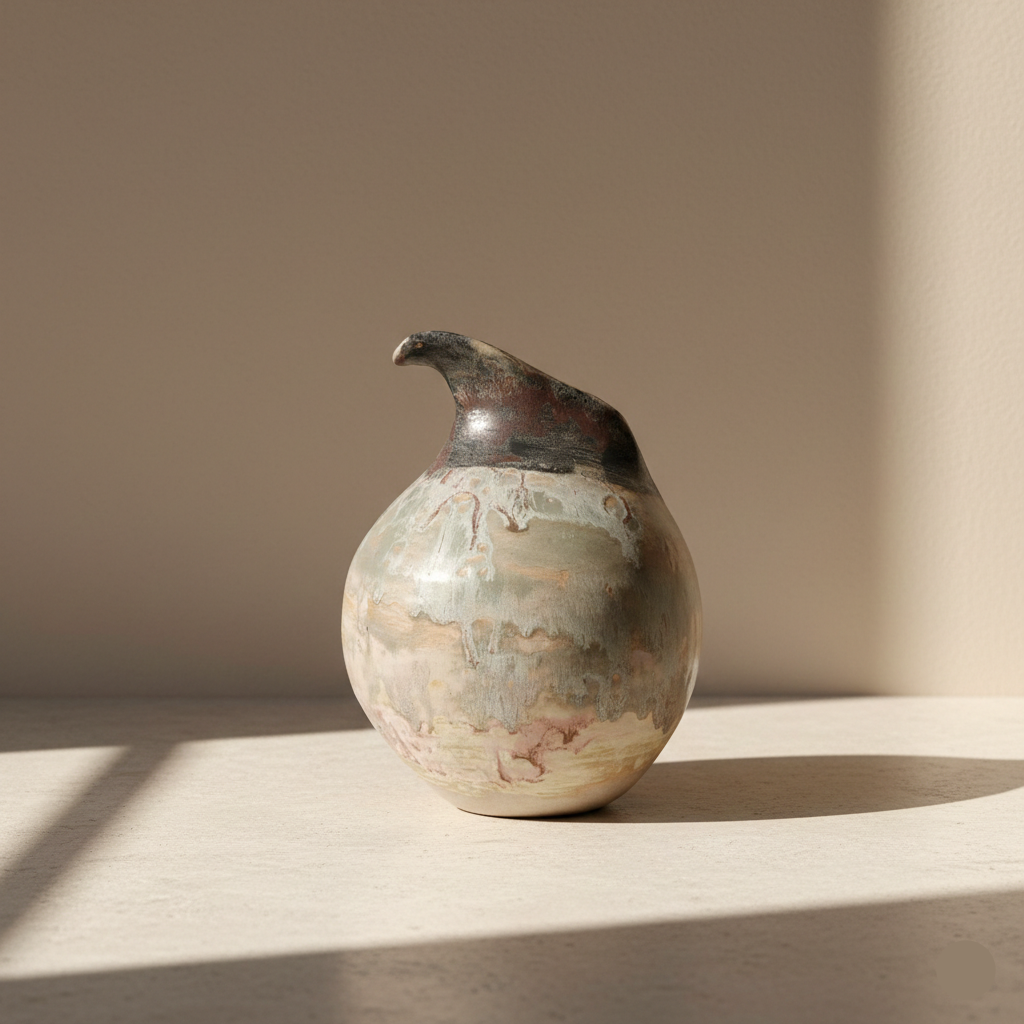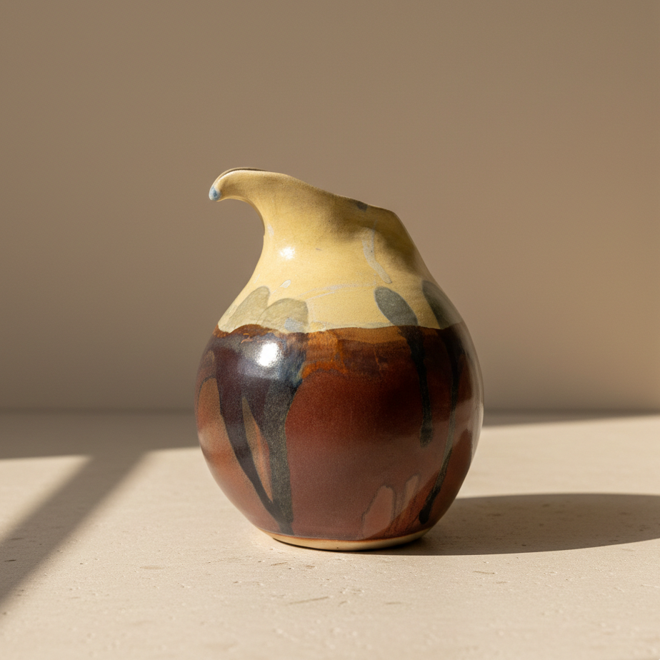 Pieza escultórica modelada a mano, de silueta asimétrica y presencia orgánica.Su acabado es un juego de sedimentación visual: esmaltes de caída libre se funden sobre tierras naturales, creando paisajes minerales únicos en cada quema. Un objeto versátil que funciona como pieza de acento o florero pequeño, aportando una textura primitiva y sofisticada a cualquier espacio.