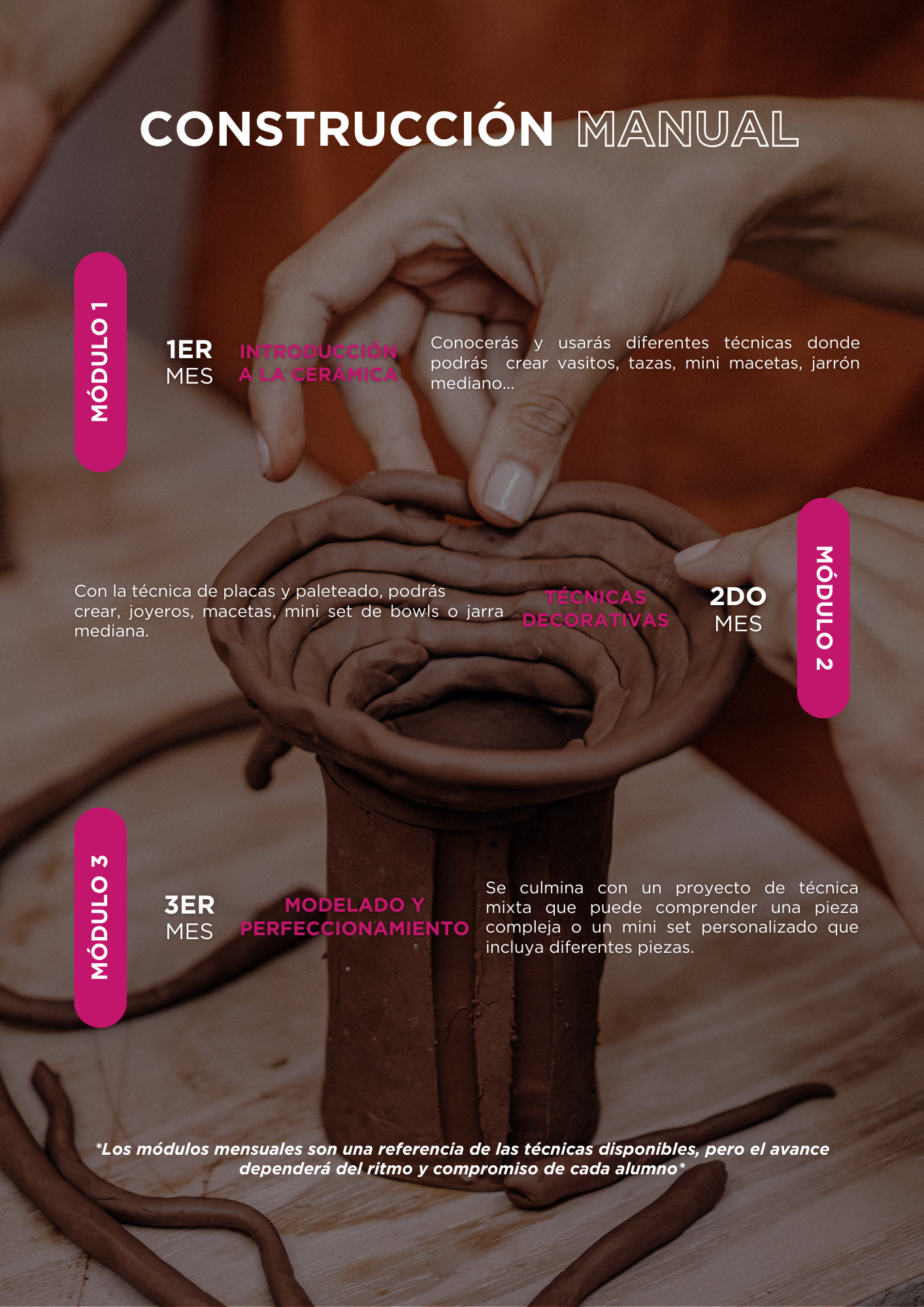 - La cantidad de piezas creadas durante el curso puede variar entre 3 a 4 piezas, dependiendo del progreso individual de cada estudiante.